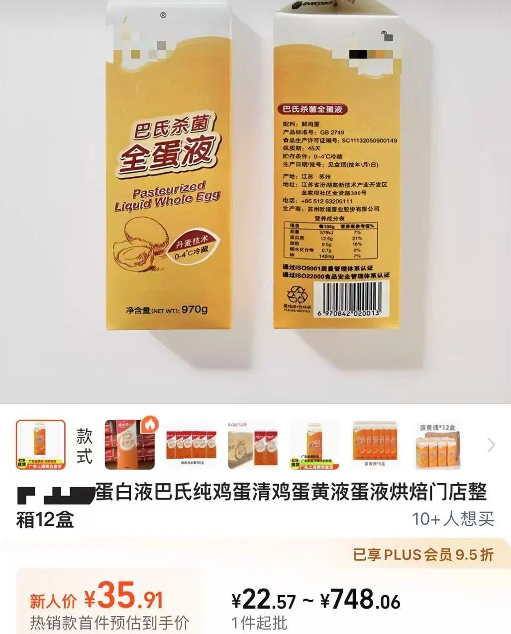 某批发平台的巴氏杀菌蛋液,比用无菌蛋便宜,可能会是摊主的选择丨电商截图