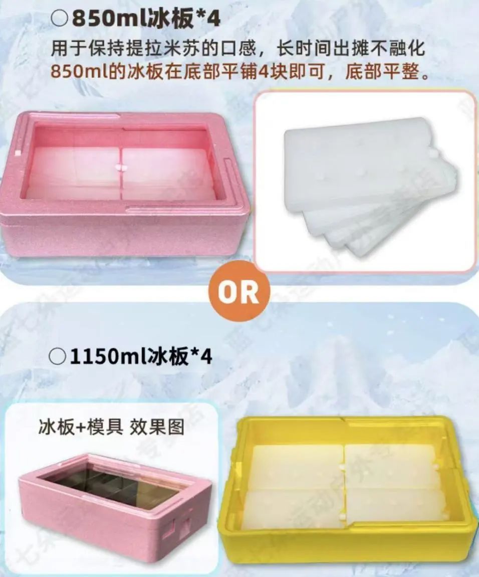 保温箱内的“冰板”是灌了水、冻成冰的塑料盒,放在保温箱底部,只能对提拉米苏的底部进行降温,而且在夏天还很容易融化丨电商截图